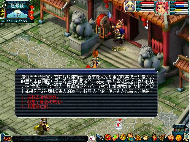 大家如果在路上看到一些小小的雪人躺在路边,可千万不要不管它们哦,赶快把他们捡起来,然后带着他们去找建邺城(112,64)的雪趣活动使者吧。