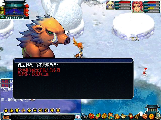 路边的小猪 小猪 小兔子 和雪趣活动使者对话,它就会把你送到雪人的身边,把你刚刚捡到的小雪块、大雪球、雪人的鼻子、雪人的眼睛统统交给雪人吧,这样你就可以堆砌属于你自己的梦想和希望啦,而且还可以得到雪人送给你的奖励呢。