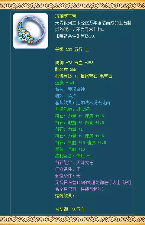 130级愤怒、罗汉腰带,算上熔炼有77点初防和333点初始气血,13段黑宝石!这条愤怒、罗汉腰带适合所有职业,不过如果不是物理系使用的话需要把它的符石组合换掉,另外它的套装效果也得换。