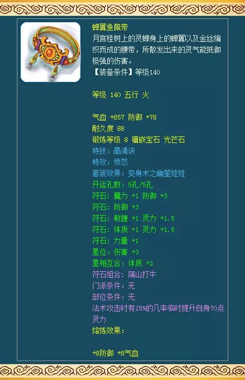 140级愤怒、晶清腰带,算上熔炼有86点初防和345点初始气血,8段光芒石!这条腰带同样适合所有职业,不过因为现在有的队伍根本不上封系,而且有了逆境特性的存在,所以晶清诀的作用降低了很多。