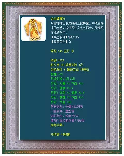 小编点评:140级女衣,算上熔炼有292点初防,敏捷单加30点,8段月亮石!这件衣服的符石组合就是盘丝所需要的,盘丝玩家拿到手就可以用!虽然打蓝盘丝是以打蓝为主,但是偶尔还是会用含情脉脉封印的,所以大家不要完全放弃封印!