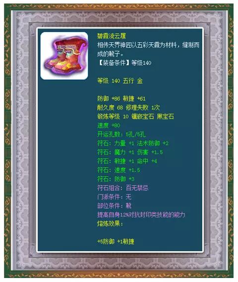 小编点评:140级鞋子,算上熔炼有91点初防和62点初始敏捷,10段黑宝石!这双鞋的性价比很高,10段黑宝石加四级的百无禁忌组合都得花掉不少钱,而且它的基础属性都快达到满值了!