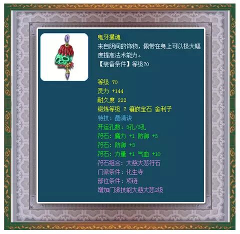 小编点评:70级晶清项链,7段舍利子,总灵力144点!晶清诀对于打蓝盘丝来说特别重要,因为她没有恢复性的技能,只靠大金顶血的话,很快就会把药耗光,所以打蓝盘丝必备晶清特技!