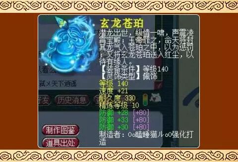 140佩饰:气血+104,气血+115,防御+33,基础属性+30速度,精炼等级10级!这是蝴蝶泉一个辅助门派的灵饰,双气血对人物血量加成巨大,能够让辅助门派在PK中在血量上有更大的优势,毕竟PK中“站得住”的角色才是有用的角色。