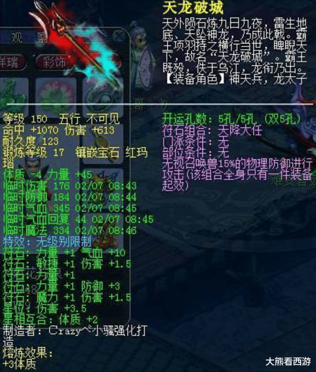 17段综合总伤达到1003,这是目前梦幻唯一一把真正达到了千伤的无级别武器,而且还有非常大的熔炼空间。但据说这把武器已经熔炼半年有余了,到现在还没融出个极限来,确实有点伤。这把弓当时的成交价是350万元,光是一把武器就能抵得上别人好几件无级别特技装备了,你们觉得他有资格做神威第一凌波城吗?