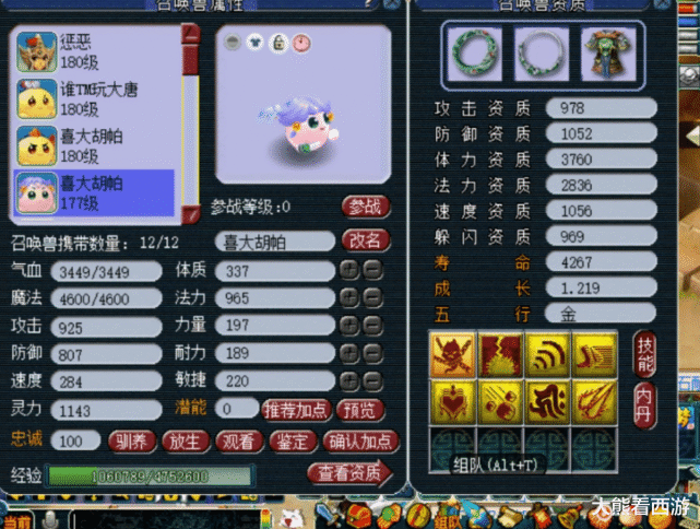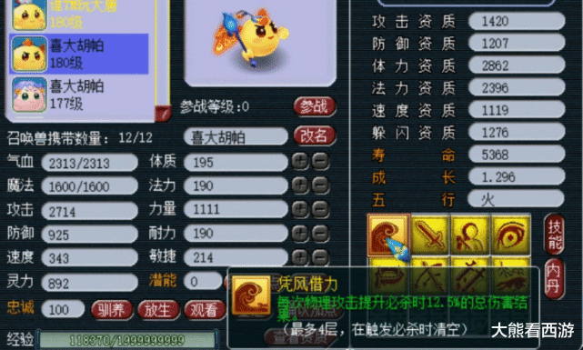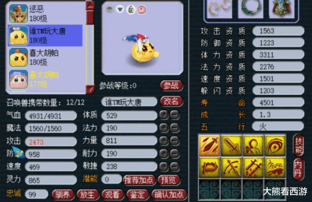 然后是剑侠客造型的8技能泡泡灵仙,虽然成长有1.3,但是资质在泡泡灵仙里面并不算太高。而且剑侠客造型的灵仙专属技能并不算太强,所以就没有怎么对它进行测试了。
