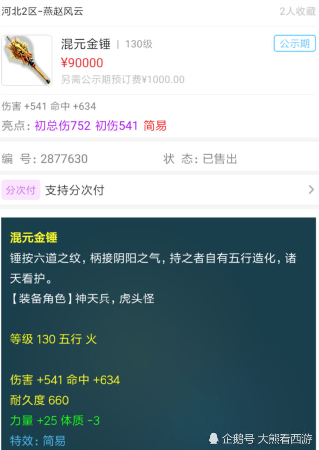 可以看到,这把简易锤子并没有附加任何其他的特技特效,而且附加属性也非常渣,减去扣的体质以后,一共就只单加了22点力量。但这把武器的伤害和命中却如同一个BUG,命中刚好是130级强化打造武器的上限,而伤害也仅仅比上限低了5点而已!鉴定出双极限属性就已经很逆天了,这还多了一个简易,卖家简直就是个天选之人啊。一个简易武器能卖到9万,而且还是公示期被瞬秒的,这确实有点夸张了。