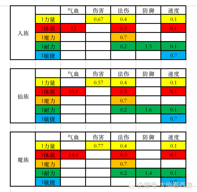 首先我们最关注的属性分别是:伤害、法伤、气血、防御以及速度这五类。而人仙魔3个种族对这些属性的加成都是不一样的。大熊也大概做了一个简单的表格,其中气血都是按照强身术140级的标准计算的。可以看出,每个种族都有自己的特性,比如仙族的特点在于耐力加成高,魔族的特点在于体质加成高,而人族则是“万金油”,各项属性都居中。那么我们就以此来分析装备到底该怎么选宝石吧!
