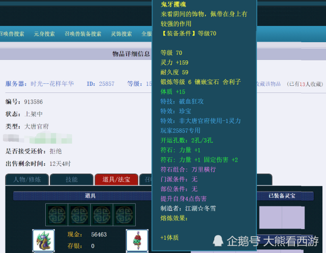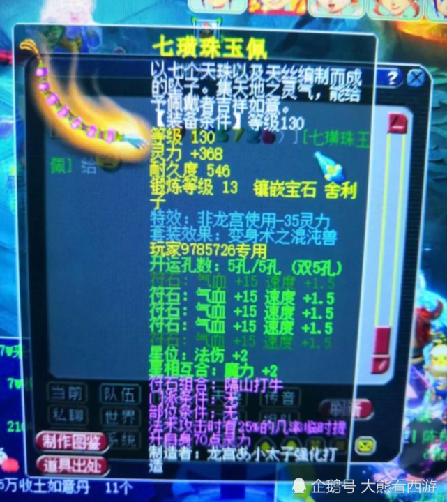 这是大熊今天在逛藏宝阁的时候发现的。这条70级破血珍宝项链,虽然宝石还没满7级,但是从灵力就可以看出远超70级项链属性上限,123点初灵都马上要赶上100级国标项链的灵力了!而且最夸张的是这条项链竟然还有一条附加属性,加了15点体质,并且还熔炼了1点体质!