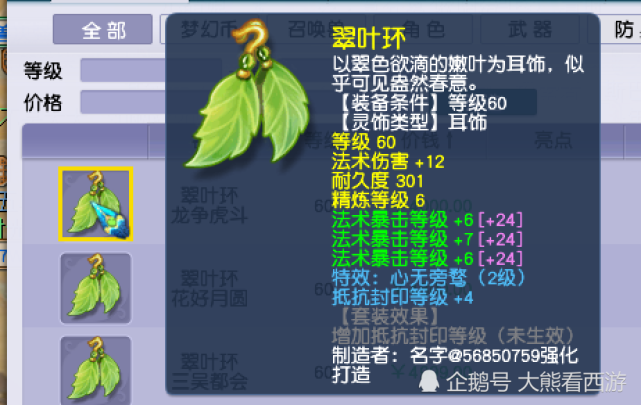 就像上面的三法爆耳饰一样,即便是60级全服最低也要卖到4000一个,而60级的双法爆一两百块区里就能一把抓了吧!正是因为这种价格差距,所以即便是系统送的绑定灵饰,如果能鉴定出好的三属性,确实也能为号加不少钱!但鉴定过灵饰的玩家都知道,3个属性都是有用的是非常难出的,那些随处可见的“绑3法伤”、“绑3法爆”的游戏ID也几乎都是在利用绑定灵饰再藏宝阁上不显示的特点招摇撞骗罢了。