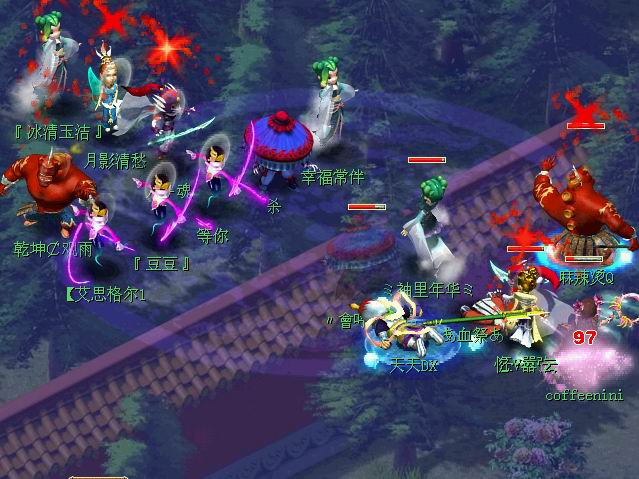 天天,血祭倒地后刀魂队重点点杀NINI,此时我们见识了COFFEENINI的超高耐,狂嚣张连击居然无保护情况下都是两位数最高才97。