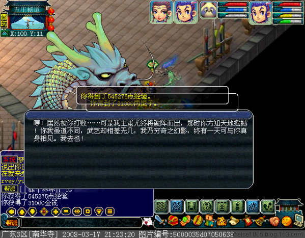 就是穷奇,废话1堆后进入战斗 此场为第4场战斗。由于DT掉线 WZ加NE 2个人5个怪也能杀过去