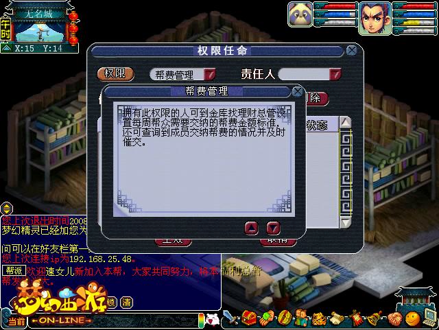 拥有此权限的人可到书院中找帮派师爷设置帮派的学费、物价、修理指数。 |
