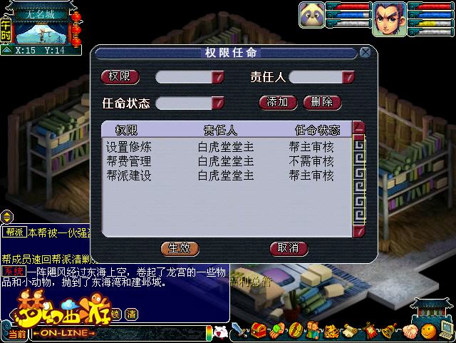 3)副帮主除基本权限外,独立权限需帮主分配后方可拥有,另外副帮主也可对帮派内副帮以下职务进行任免职;