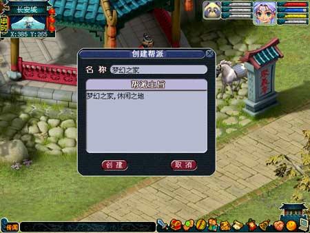 《梦幻西游》的帮派是通过玩家自行申请建立的,需要申请人的等级≥40,并且当前没有加入帮派,也没有申请加入其它帮派,满足条件的玩家可以在长安城找到“帮派主管”(384,270)申请建立帮派,需要缴纳300万梦幻币作为申请费。