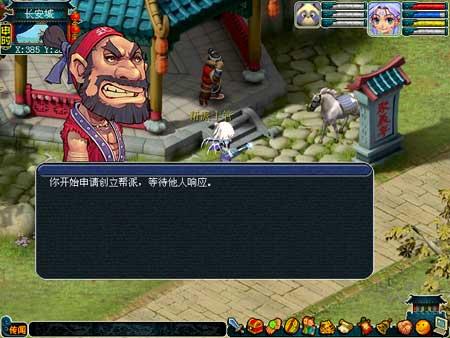 申请步骤:找到“帮派主管”对话,选择“新建帮派”,输入帮派的名称(最多七个汉字)和宗旨,再点“确定”即可,需要花费的申请费用在现金中扣除。申请后需要等待其他玩家响应,要求响应者等级≥20。响应人数达到20的时候帮派建立成功,申请者成为帮主,响应者成为帮众。