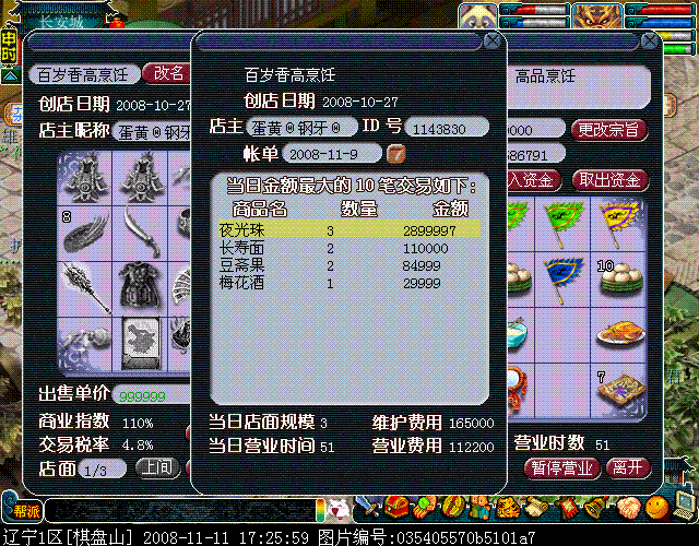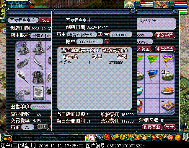 08年11月,在11月底与12月之初,夜光珠涨得历害(我区价格在70 80万收的人多的是),而在刚刚前几天价格还在15万。怎么短短几天就差距这么大呢。其实它的曲线发展是有规律的,刚开始有人15万收,后来就是30万,接着45万,一路飑升,大家都在收,把夜光珠的价格推到了至高点。而钢牙在早期就明显感觉到夜光珠的价值所在,所以赶在涨价时收了些,放在店里慢慢卖,刚开始卖66万,最后全卖99万。也一转眼就卖出去了。到了12月12门派活动后,一看世界上全是得五宝的人,感觉这块市场已经不能再做了,我就顺势收了金刚与定魂把剩下的夜光珠一起换高级宝图。非常巧的是换了三张高级图:傲来-高级吸血,东海湾-高级法术连击,PT-高级慧根。(跟你说别说我吹牛,也别得红眼病啊)