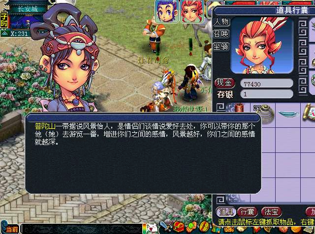 紫霞仙子会给玩家一份“风景图”,并告诉玩家一处风景怡人的地方,是情侣们谈情说爱好去处,玩家可以男女两人组队游览,增进两人的感情。到了仙子所说的地方使用地图就可以完成任务了。不过路上要注意安全,小心山贼哦!