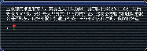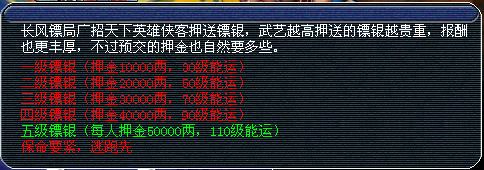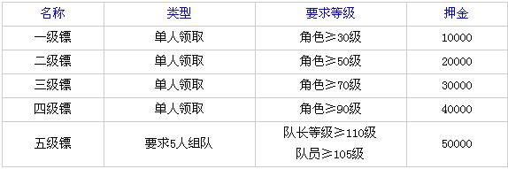 一级至四级镖都是单人领取的,是传统的押镖方式,而五级镖是需要五个≥110级玩家组队完成的,对任务要求也比较高,相当得到的奖励也比较好,我们下面对五级标做一个详细的分析和探讨。