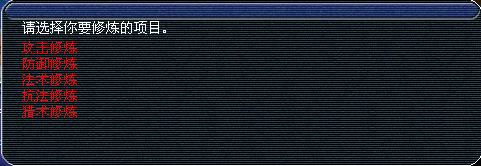 拿了任务后他会要你选择修炼类型,大伙根据需要自己选吧。(猎术,攻击修炼和法术修炼每次镖完成得到修炼经验大约=6000金钱,防御修炼和抗法修炼每次镖完成后得到的修炼经验大约=4000金钱。)