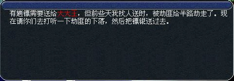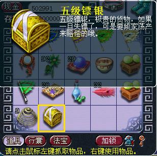 把贼匪打败后,便得到金光闪闪的五级镖。小心哦,镖遗失可是要倾家荡产来赔偿哦。然后把镖交到任务要你去的地方,很幸运,我要去找大大王,就只需要走几步就到了。得到镖后就不可以使用飞行符和导标棋了,老老实实跑吧。