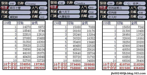 第三,就是经验。一般赚钱号的经验可以用来修炼1J法宝,从表格里可以看出来,109的师门,20个下来70W左右经验,而109每天可以修炼大概70W的法宝经验,相对比较平衡,但是算上3级药的奖励加成和节日礼物等的经验,总的来说,109级的号经验会越来越多,但是还可以通过修改法宝五行来降经验。再来看130左右的号,20个师门75W经验左右,而130的号修炼法宝每天消耗大概220W,明显不够用,所以对于用来练法宝的号,经验还是相对比较重要的,这也成为了之前说的,遇到要环了选择交环的一个有力证据。一般这类号用来摆摊比较合适,当然辅助技能你自己得点点好,再配合接到月光法宝,5-10W/次的生意还是不错的。主号经验我就不多说了,需求量很大,能赚就尽量赚,所以要珍惜前20个双倍奖励的师门。