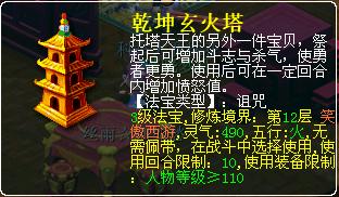 笔者一直认为如今特技遍地开花的罪魁祸首就是这个小小的塔,使得对方的愤怒值变得难以控制。对方5个人全部有塔,己方几个封系的笑里藏刀必然是首尾难顾,何况还要去封印。且不说封系需要释放大型特技,单说笑里藏刀,它本身也属于特技,如果自己连使用笑里藏刀的愤怒值都没有,那么谈何控制?这也就是作为一个封系,乾坤玄火塔是必备法宝的最根本原因。