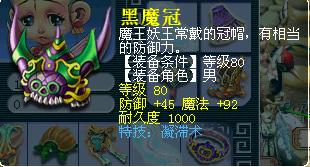 同样,经验金钱受双/三倍时间,物品奖励有彩果、C66、宝石、80武器装备、花豆、宝图等。其中80武器装备不是环装,下面这个80男头就是杀妖王得的: