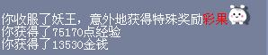PS:大致是等级越接近场景等级,所得经验金钱奖励越多。很遗憾这次没有获得物品奖励,在三倍效果下,奖励看上去不错,但吸引玩家杀妖王的主要是物品奖励,尤其是彩果,此外还可能获得C66、强化石、变身卡。杀妖王得彩果的几率还是不错的,甚至高出某些较大型的活动。小农的最高记录是5开杀妖王,队里2个号同时得彩果,还得过2次。
