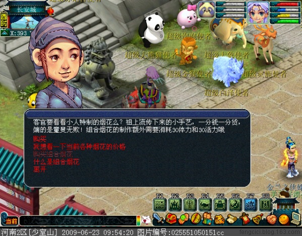 长安飞机场下面(393.207),有位流浪艺人,点他选取【购买组合烟花】如图: