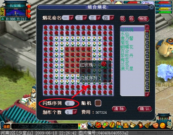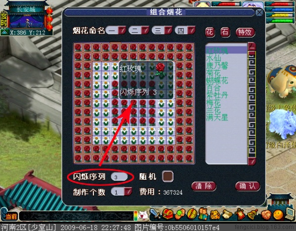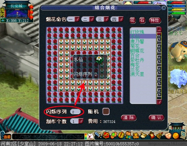 闪烁序列,顾名思义,就是烟花燃放过程中,花或石所闪烁的时间次序,这里面你可以填上数字1-99,这里可以让你的图案闪烁有个时间的顺序,如下图,我们把整个画面分为三部分:内部红玫瑰,中间水仙,外部红玫瑰。