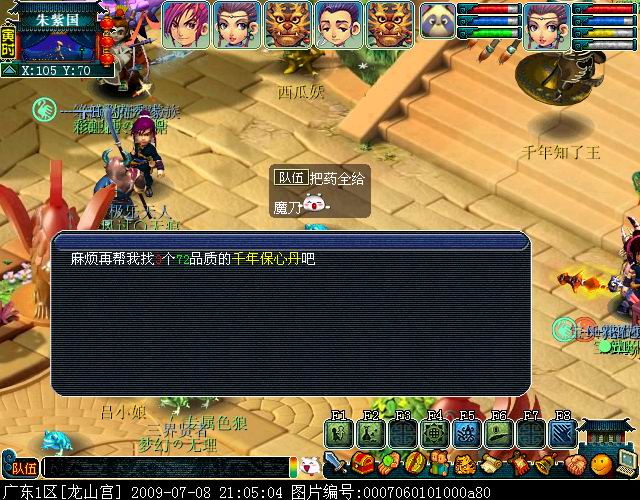 6、帮吕小娘找5个三J药(我们要的是72品以上的千年保心丹)注:品质和三J药都有可能随机刷不同的(NPC要的药和烹饪都交给队长给予NPC)