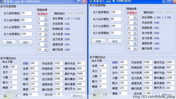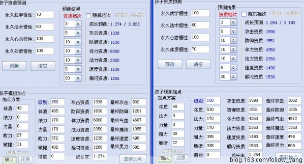 由上图可以看出,无论是血敏加点,或者血敏耐加点,各项属性对比,100武70体的孩子都优于70武100体的孩子。