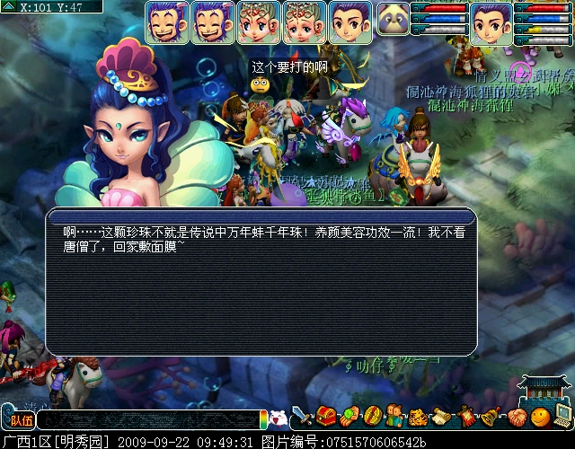 得到三个珍珠以后,要把三颗珍珠分别给与三个蚌精,把他们赶走。(三个蚌精坐标分别为:珍珍(99,46)珠珠(110.66)美美(102.40),然后向姜国师复命。)