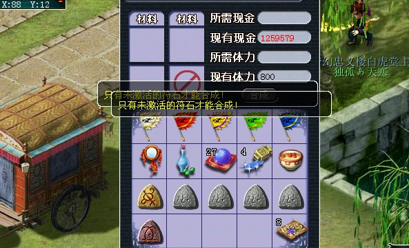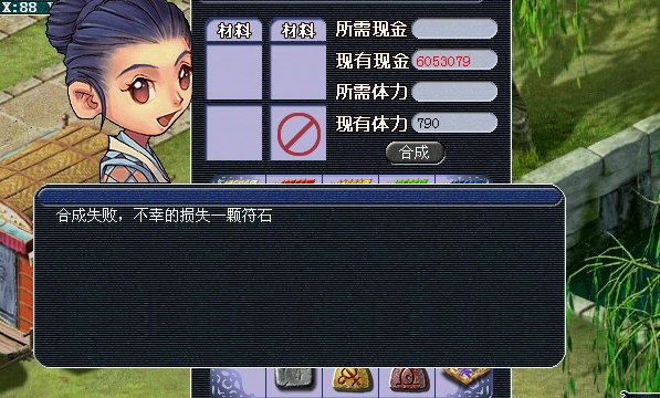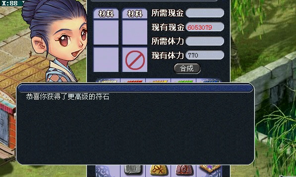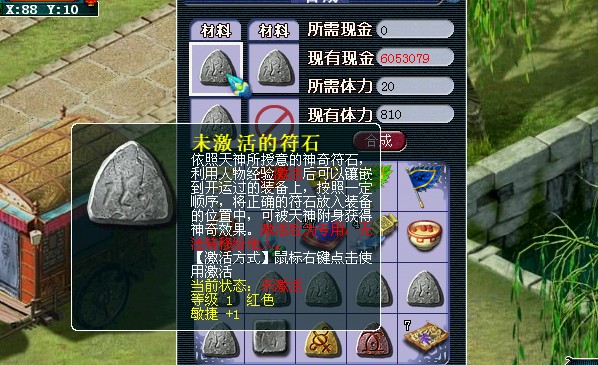 长安城(91,10)仙符道人,他可以算作是符石专属NPC,此处可以合成符石,也可以给装备开运(装备开运随后有详细介绍)。合成符石规则与合宝石差不多,其三个原材料符石等级必须相同,并且必须为未激活的符石。目前官方所发放的最高等级2级符石,就在此处合成。合成时需要体力,不需要金钱。成功率约在60%左右(小夏合了5次,有3次成功),合成失败后随机掉一个符石。笔者建议合成时用一些属性不好的符石来进行合成,因为成功与否,获得的2级符石颜色与属性都是随机的。
