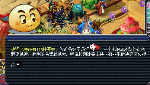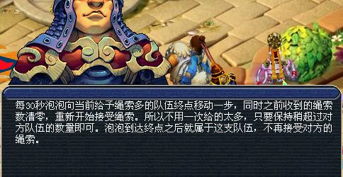 比赛规则:玩家可以通过主持人那获得任务来获得道具“绳索”,然后将获得的绳索交给泡泡,让泡泡朝自己一边移动,泡泡到达终点后就不会再接受绳索了。