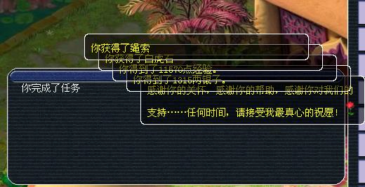 一、领取绳索任务:任务要求你去相应的地方做一个表情,然后燃放烟花,就可以得到相应的经验和金钱以及随机物品。(提醒:1、随机获得的东西有宝图和强化石头等。2、当然要记得去罗道人那里准备几个烟花,万一忙中出错点了烟花还得重新买烟花去点这样浪费时间。3、这个任务比较麻烦,因为坐标经常是在偏僻处,小记认为在主持人那插一面旗,然后朱紫四面八方相应的插上棋,飞到附近更方便先。)