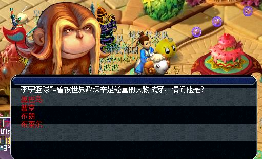 (回答的问题大多是有关**产品的信息,当然还有一些古代诗词,而且会经常重复:答案分别是“奥巴马”“一切皆有可能”“**”,当然还有其他的题目不一一列举。回答错误可以重新回答,但是你要确保你旁边没人跟你抢答,呵呵。回答完毕后可以获得相应的经验和金钱,同时也获得绳索)