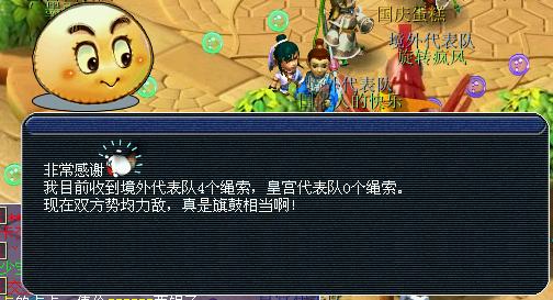 总体来看,这个拔河比赛与以前推出梦幻嘉年华的拔河比赛基本相同,估计梦幻与**的合作才会会奉献出梦幻的这个“保留节目”。2场比赛耗时大概40多分钟,经验还可以,就155人物来说:拿领取绳索任务一次就是1W多点经验,而点击猴子则只是7000多。而且最后刷的满地宝箱经验不错7W5一个,不过抢的人也多。物品奖励有强化石、宝图、植物种子等,其他的奖励暂时还没有触发,记得以前经典的拔河比赛有彩果、C66奖励等。