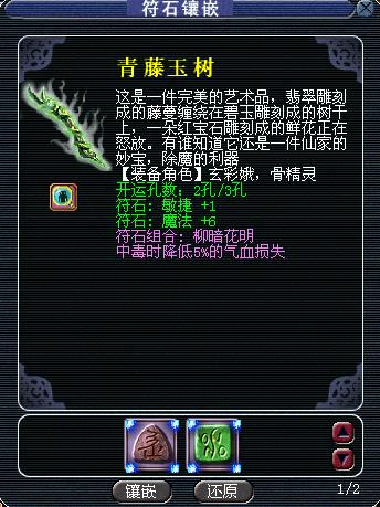 简评:红+蓝只能提高50点暗器防御,加入其它符石还可能会提高更多的暗器防御,具体方法目前不太明确,对69、89比武有些作用,但和技能移花接木是没得比的。