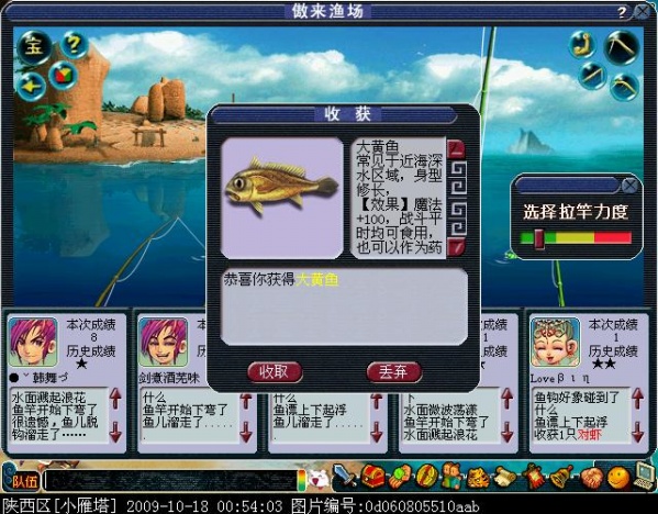 最好和熟悉钓鱼的朋友组队,遇到奇异的闪光时可以帮助拉杆,成功掉得随机傲来或长寿二级鱼后,参与帮助的每个人钓鱼积分会对应增加。