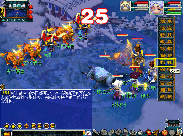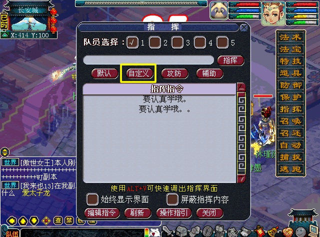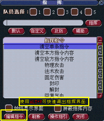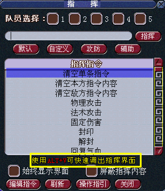 进入战斗后,有两种方法可以呼出指挥界面,一种为点击“指挥”按钮,另外一种则是使用快捷键“ALT+V"。细心的童鞋应该注意到喽,ALT+V在非战斗时时呼出梦幻精灵的快捷键。
