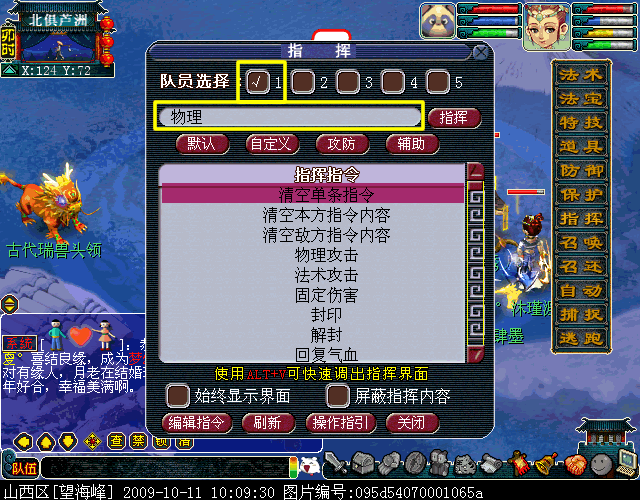 队员选择:当你点击数字前面的方框时会出现一个对勾,说明你选中了队员一号,将对其发放战斗指令。反映到怪身上的指令也会在最前面加上相应的数字。(例如选择队员一,指令前会自动加“1,”)