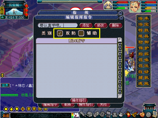 攻防、辅助:同样与左下角的“编辑指令”有关系。为了防止指令过多,寻找的时候不好找,所以可以选择类别进行区分。[/img]