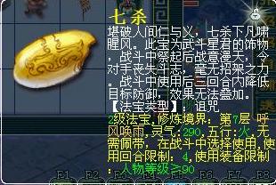 当110以上的DT祭上干将时,尚不能将这个法宝掌控的109DT们是否也有几分憧憬和艳羡,其实在109也有不错的DT二级法宝,那便是七杀,当你不幸被封时可以尝试使用这个法宝,而后解封,横扫的伤害也会有所提高,不过可惜的是,经过测试这个法宝的效果并不十分明显,加上有四回合的限制所以发挥起来也不是很完美,如果你们有足够的经验可以选择修炼。