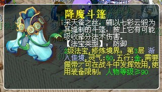 总结:此法宝需要佩戴在身上才会起到效果,而且不管该法宝的层数高低,在触发时候的效果是完全一样:抵消50%法术伤害,层数级别的高低只是对触发保护的几率有影响。在整个测试的过程中,0层是150回合都没有成功的触发,1层97回合触发过一次,2层83回合触发过一次,3层在37回合触发;4层在31回合触发...当然了,在短短的4个小时里400多回合的测试不是太精确,但是足以说明这个法宝的触发几率确实不高。此法宝对法系的影响,就目前的情况来看,在低层次的情况下,效果不明显,预计在满层的情况下,大概也只会有20%上下的触发几率,而且这个是90级才可以接到的2级法宝,只可以佩戴一个,应该说对PK的格局影响不是太大。个人看法就是109阶段的比武玩家比较有优势,很多玩家反映了一个问题,就是说为什么金甲69的玩家可以带,斗篷却要90以上,觉得不公平,其实这个问题关于这个不难理解:90以前LG等法术门派优势不明显,本身的攻击能力就不高,要是斗篷也是一级法宝,可以带2个的话,那样怕是法系门派就真的没有出头之日了.今天关于降魔斗篷的法宝的测试报告就到这里,等到有玩家修满欢迎发出效果和大家一起交流,如果我的报告有什么不足,欢迎大家批评指正。