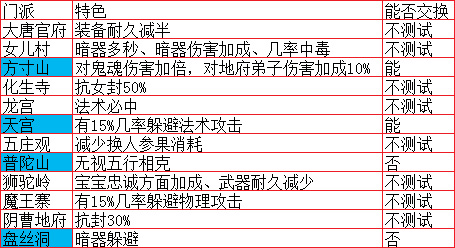 除去绝大多数影响不明显的以及几率性的门派特色未进行测试外,其余的方寸山、天宫、普陀山、盘丝洞的门派特色能否交换,小记都一一尝试过,测试结果如上表。