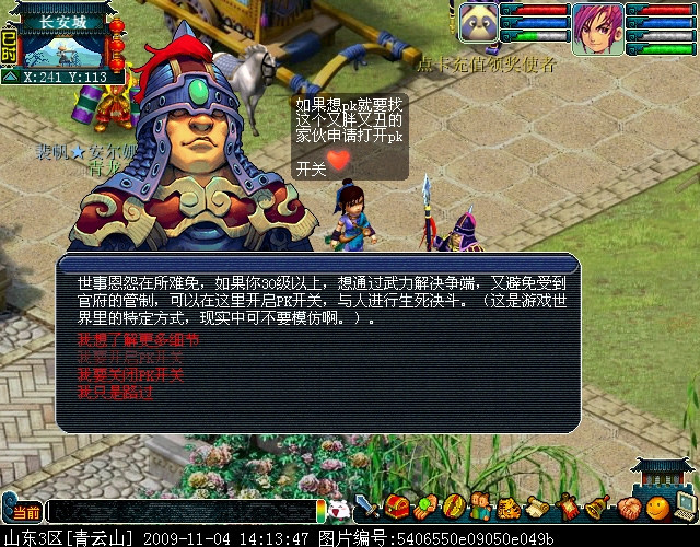 大于或等于30级的玩家可以在长安城找到“PK申请人”,通过对话开启或关闭PK开关。开启开关后24小时(在线游戏时间)内不允许关闭,但是此时间段内如果在被动PK中死亡则PK开关自动关闭,可以再次开启。