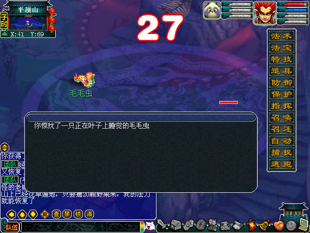 分支2:进行战斗,怪物造型海毛虫,双不抗,血少,速度略快,有门派法术,一般一回合解决