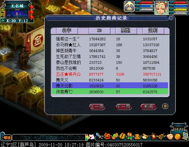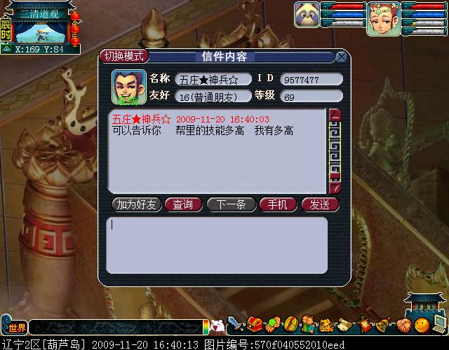 刚开始,某嫣还不太相信,69的小号,能有多厉害!那位小号MM说:“你看他帮贡,都6万多了!”打开帮派界面一看,果然。6W帮贡的数字,华丽丽的雷到了某嫣。于是乎某嫣趁热打铁,立即与这位神兵敲定了白虎堂跑商的事宜,也认识了这位话不太多的五庄。
